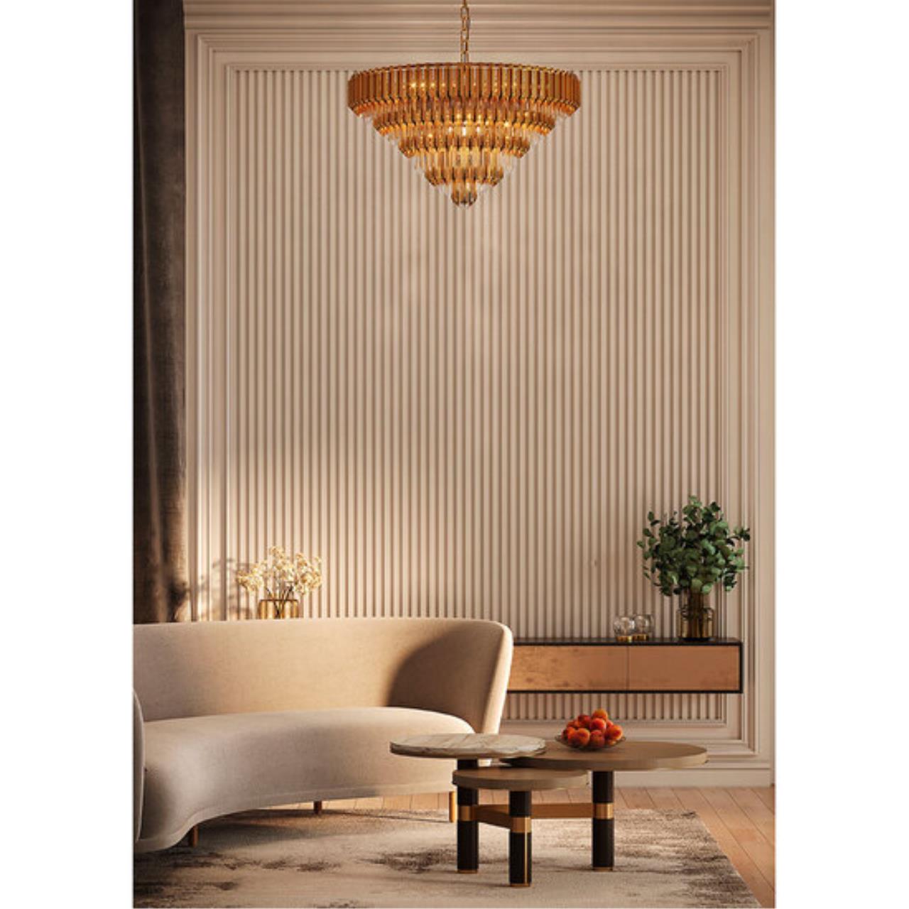 Свободно свисающие хрустальные декоративные элементы, расположенные в несколько рядов, образуют объемную конструкцию, которая при движении воздуха в помещении начинает «звучать». Сочетание золотых и прозрачных декоративных подвесок создают яркий, ослепительный образ модели. В коллекции четыре люстры разных размеров, есть возможность подобрать в помещения разных форматов. Большое бра может быть дополнением в ансамбль с люстрой, а может быть самостоятельным украшением интерьера.