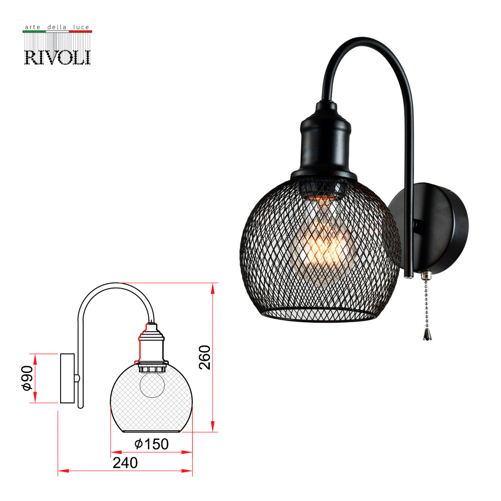 Rivoli Rebeca (арт. 5096-401) – аккуратное металлическое бра с решетчатым плафоном и удобным выключателем на корпусе. Светильник-бра окрашен стойким гальваническим способом с базовый черный цвет, который помогает расставить в интерьере акценты и часто выбирается профессиональными дизайнерами. Настенные светильники Rebeca созданы итальянским брендом Rivoli в популярном стиле лофт-кантри. Такие бра настенные станут превосходным решением для зонирования пространства и создания уютной атмосферы. Светильник-бра Rebeca с металлическим плафоном применяется с 1 лампой Е27 40 Вт. Бра Rivoli Rebeca решетчатое создает красивый световой рисунок на стене. Бра из металла является прочным и надежным, прослужит долго, с легкостью перенесет переезды. В качестве бра в спальню или бра над кроватью это превосходный вариант. Современные бра Rivoli Rebeca от европейских дизайнеров выглядят лаконично и универсально дополняют любой интерьер. Такие бра хороши для стилей-бестселлеров - лофт и скандинавский. В пару кликов можно заказать это стильное бра по доступной цене на нашем сайте. Помимо бра, в коллекции Rebeca есть подвесной светильник - арт. 5096-201.