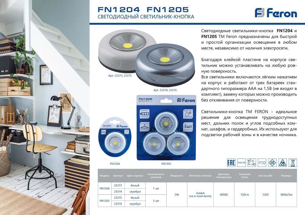 Светодиодный светильник-кнопка (1шт в блистере) 1LED 2W (3*AAA в комплект не входят), 69*25мм, серебро, FN1204