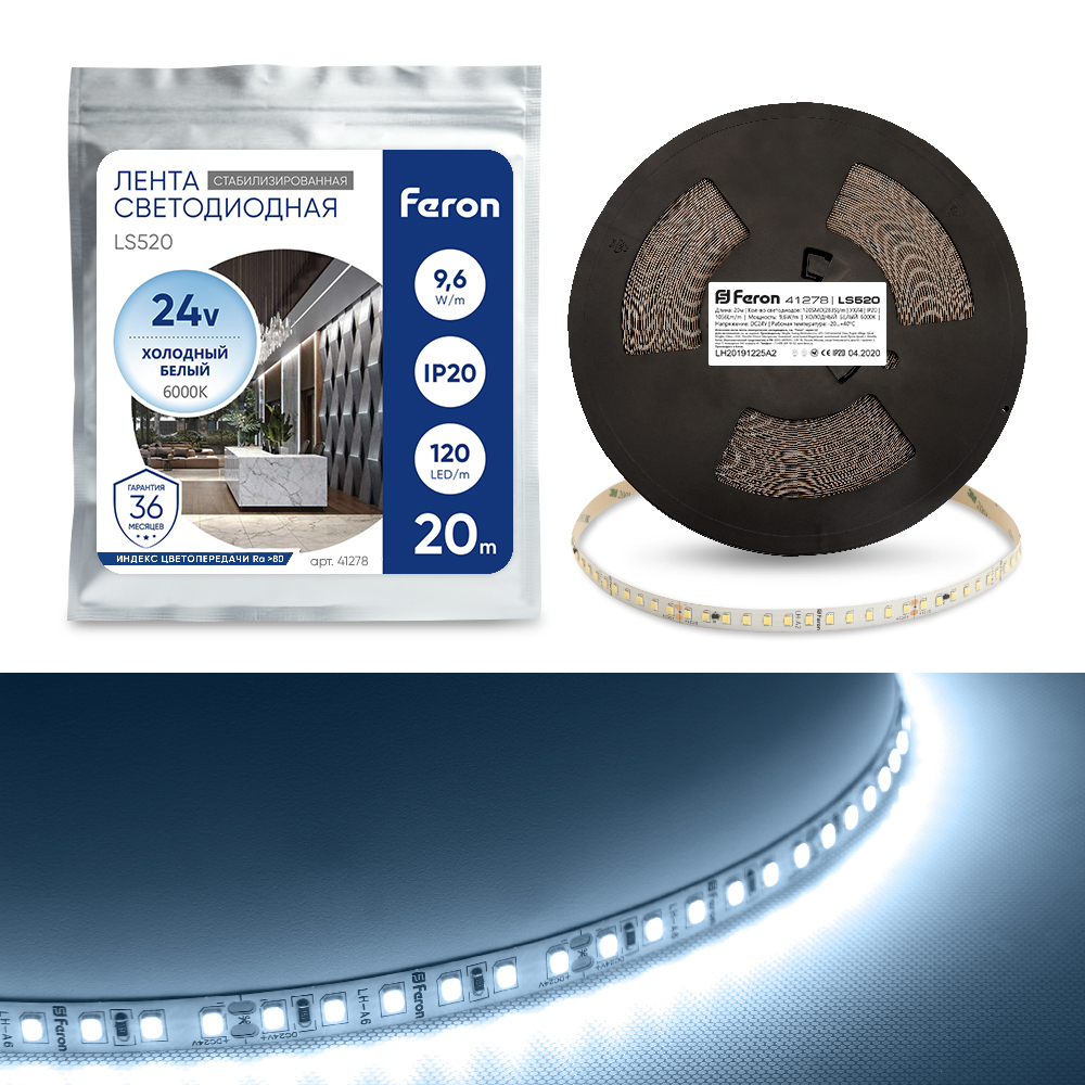 Лента светодиодная 24V FERON LS520, 120*SMD2835, 9,6W/m, IP20, 6000К (холодный белый), Кратность резки мм 100мм, 20000*10*1.22мм