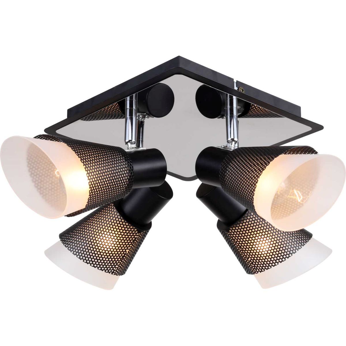 Потолочный спот из коллекции Vesto / Весто выполнен из металла, окрашенного в черный цвет. Отдельные элементы арматуры гальванизированы в цвет хрома. Корпус спота декорирован нержавеющей сталью, отполированной до зеркального блеска. Источники света закрыты двойными плафонами: внутренние из матового стекла, внешние - в виде сетки черного цвета. Плафоны имеют поворотный механизм.
