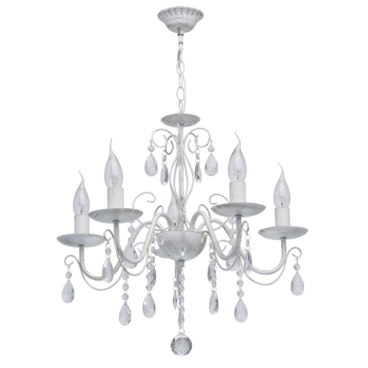 Люстра из коллекции «Аврора» выполнена в благородном классическом стиле. Её металлическое основание матового белого цвета дополнено эффектом золотой патины. Грациозно изогнутые рожки и декоративные завитки гармонично сочетаются с источниками света в виде свеч, а крупные подвесы из прозрачного декоративного стекла завершают царственный дизайн.